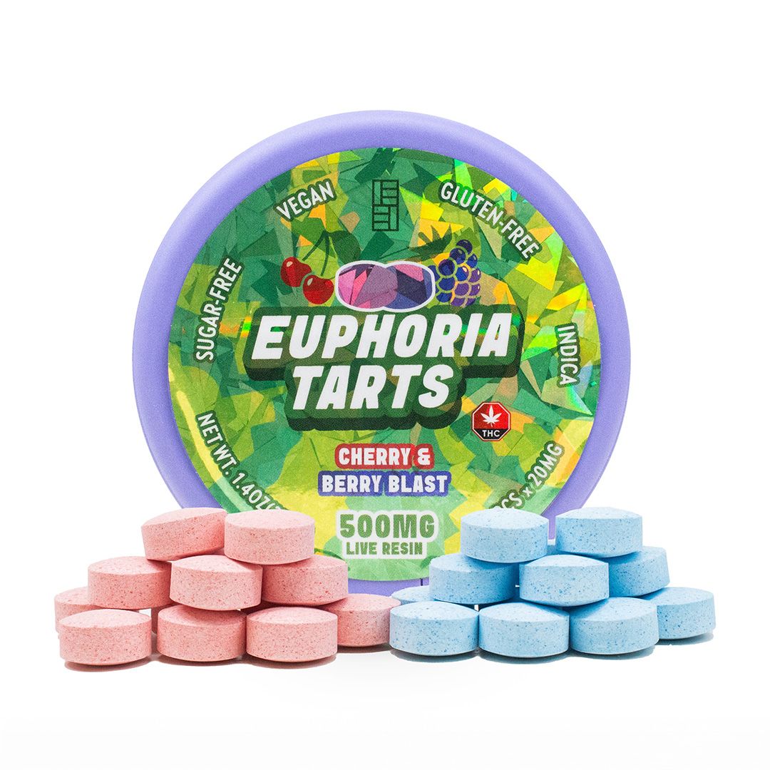 Euphoria Tarts are live resin–infused hard candies delivering bold cherry and berry blast flavors with a refreshing, cooling finish. Each sleek container holds 25 pieces and is perfect for discreet, on-the-go enjoyment. Available 20mg doses, these tarts are your pocket-sized companion for smooth, flavorful, anytime elevation.